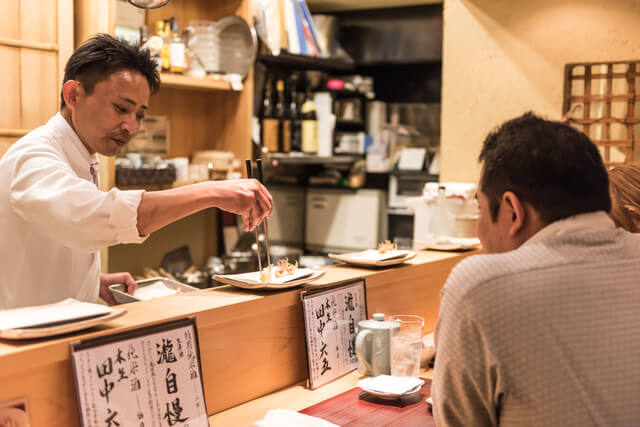 お席についた瞬間から最後の一品を食べ終えるまで、お客様に心地よい時間を過ごしていただけるよう、お食事の流れを考えてコースを組み立てたり、お声がけさせていただいたりと、心をくばっています。
